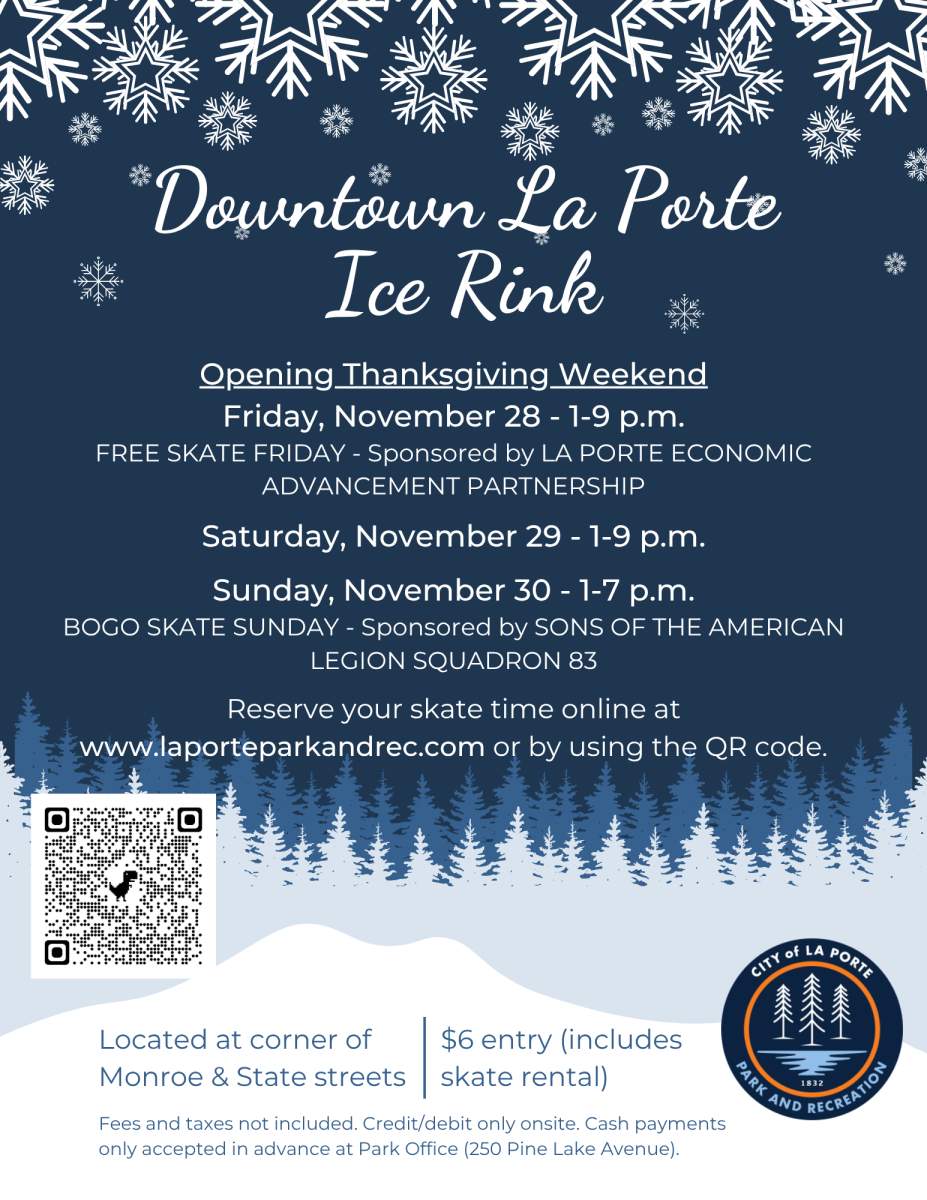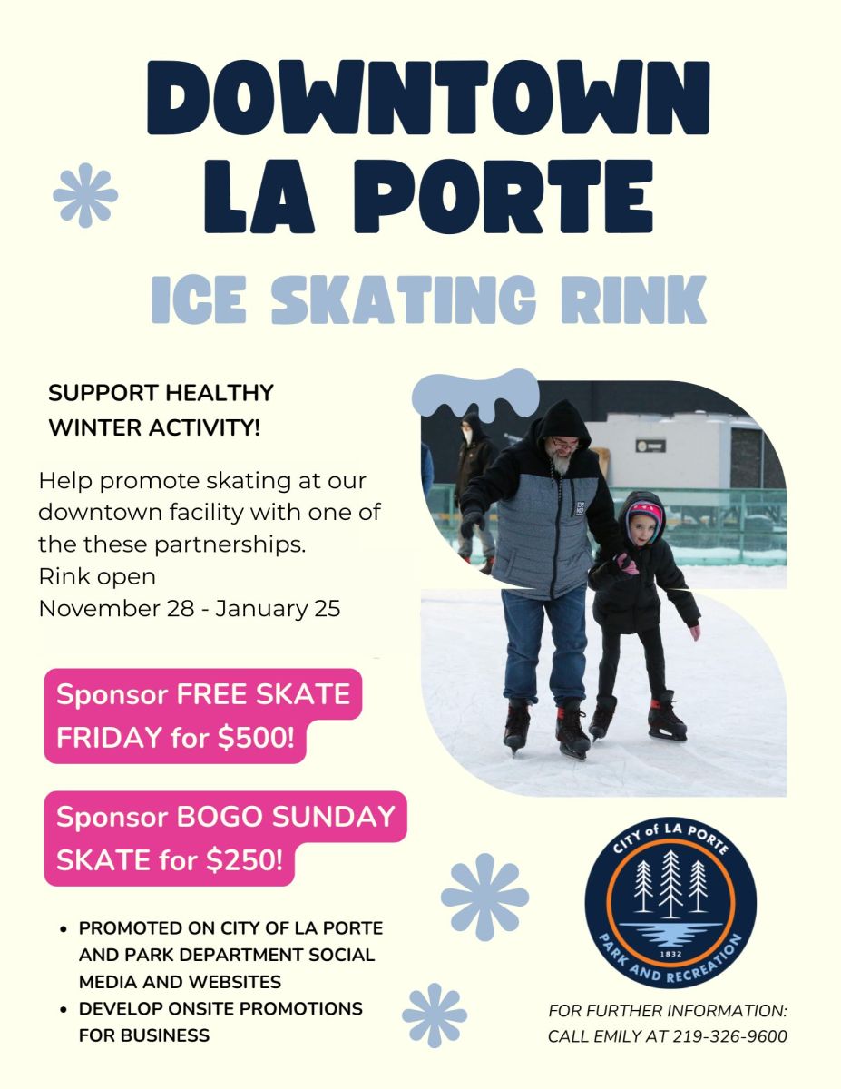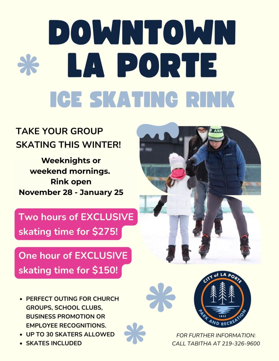 The Downtown La Porte Ice Rink returns this winter to the corner of State and Monroe Streets (near La Stitch). With over 300 pairs of ice skates available for rent, the rink provides plenty of sponsorship opportunities, group skate outings, skating lessons and more!